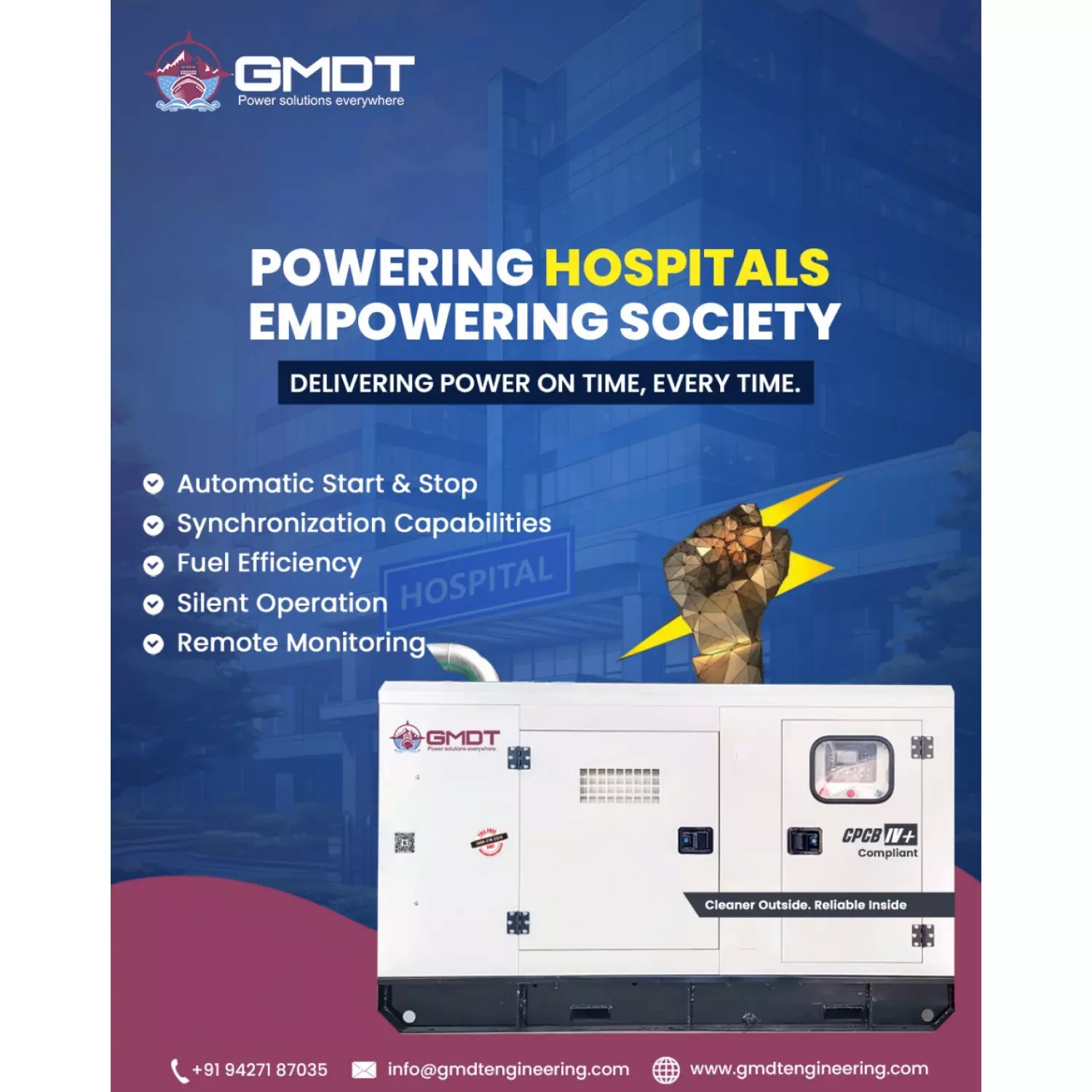 🔹 Diesel Generators (Prime & Standby) 🔹 Silent Canopy & Portable Generators 🔹 Containerized DG Sets for large projects 🔹 Automatic Transfer Switch (ATS) Panels 🔹 Synchronization Panels 🔹 Generator Rental Services 🔹 Annual Maintenance Contracts (AMC)